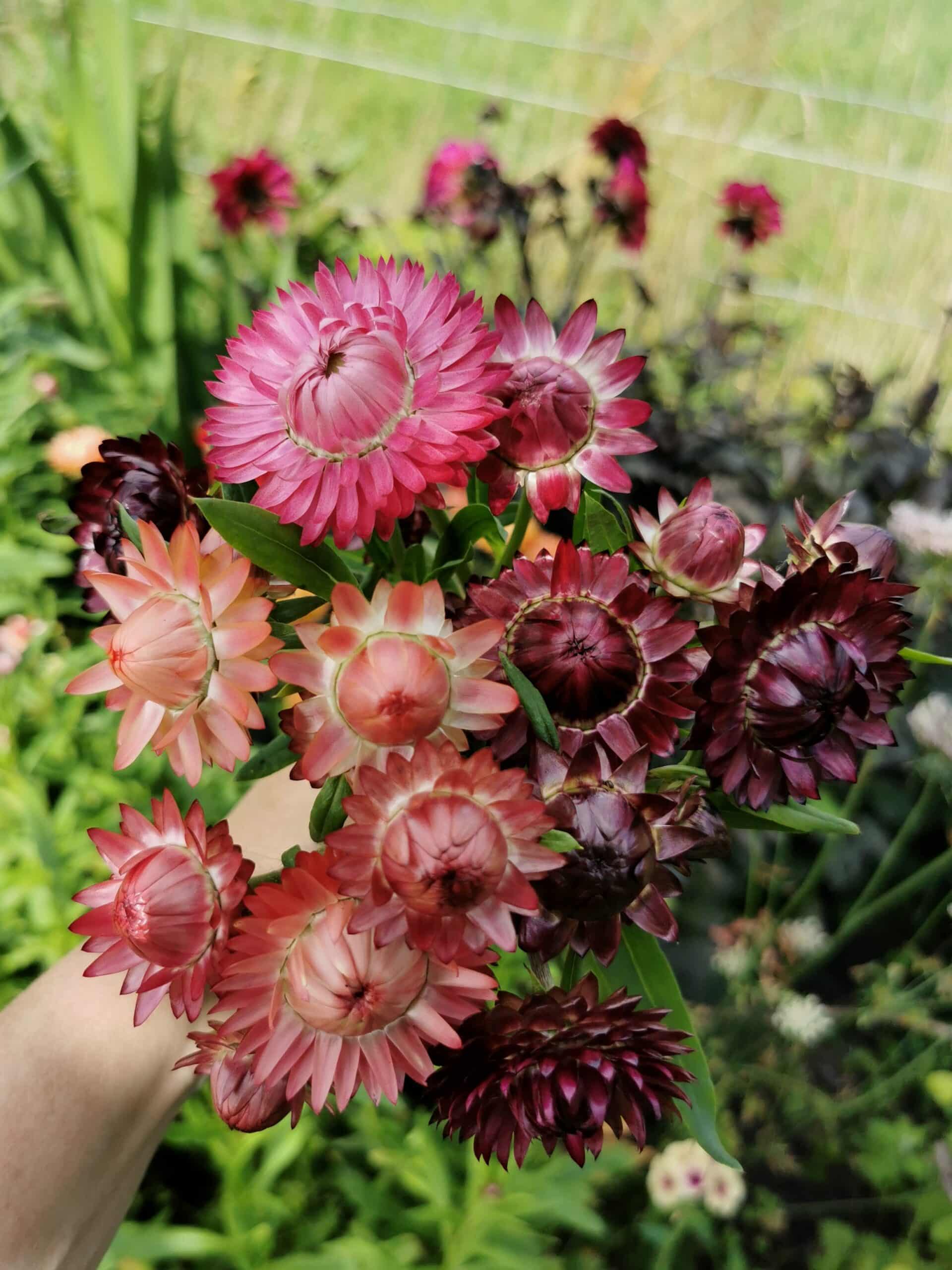 Deze staat bij mij met stip op nummer 1. Ik hou van het knisperen van de glanzende bloemblaadjes en de prachtige tinten die ze kunnen hebben. Mijn favoriete strobloemen zijn de dieppaarse ‘aubergine’ achtige tint en de abrikoos tinten. Maar ook wit, zachtroze en licht geel zijn prachtig. Na het drogen behouden ze hun kleur heel goed. Pluk ze wanneer het hart nog niet helemaal open is, anders kunnen ze gaan pluizen.