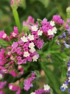 Deze eenjarige bloem laat zich makkelijk opkweken en komt voor in veel verschillende tinten. Van fel geel, intens blauw en donkerroze tot paars, lila, wit en mijn favoriete tinten abrikooskleurig met vleugjes roze. Hommels en vlinders zijn er gek op, zij kunnen eerst van de bloemen genieten voordat je ze oogst. Je plukt ze het best wanneer het kleine witte bloemetje in de bloemen ook is opengegaan. Limonium behoudt zijn kleur heel mooi in gedroogde vorm. Verwijder het blad langs de steel wel, want dit droogt niet mooi in.