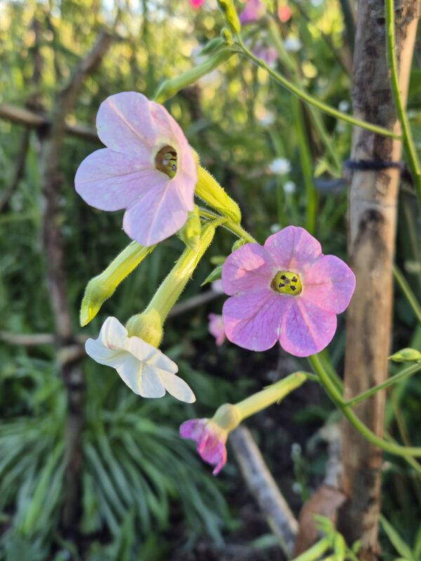 Een eenjarige siertabak met roze en witte kelkvormige bloemen. H: 80-120 cm