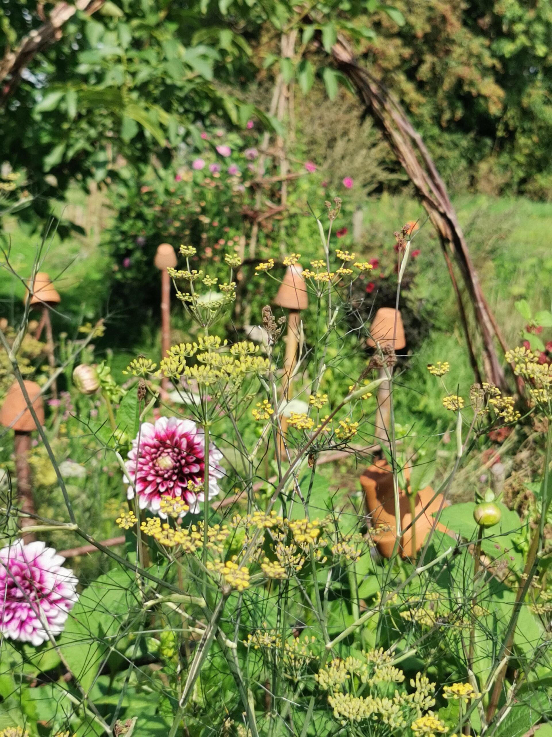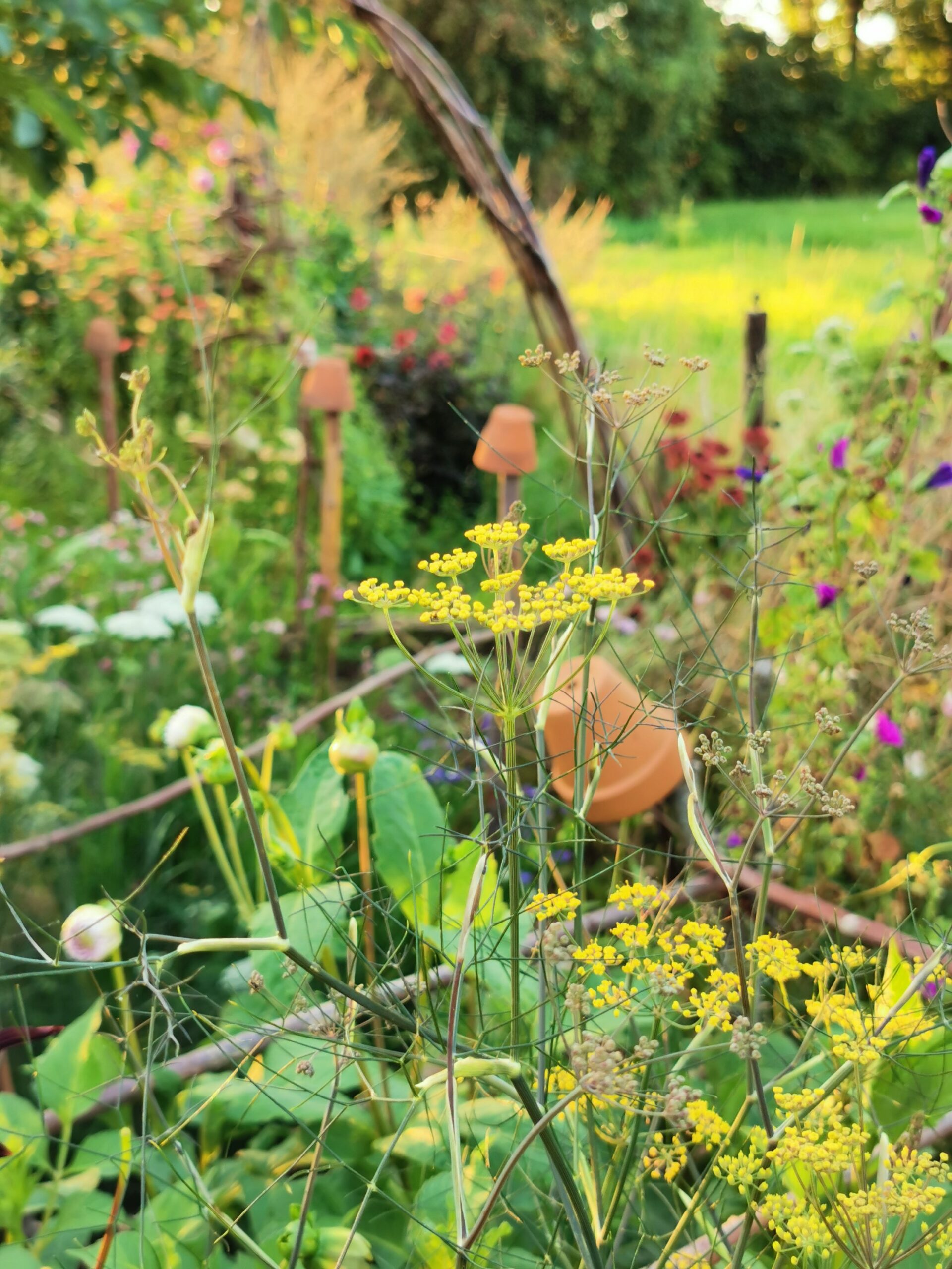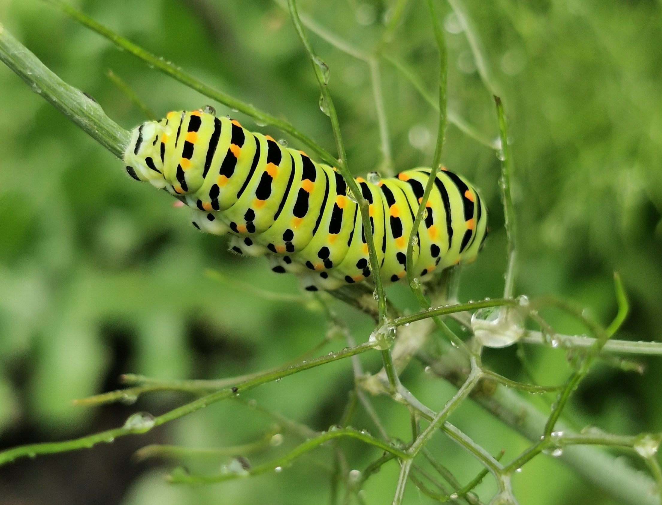 Bronzen venkel trekt veel nuttige bestuivers en andere insecten. Ook is het een van de waardplanten van de Koninginnenpage. Ze legde dit jaar haar eitjes op de venkel, met als gevolg prachtige rupsen. Altijd weer een bekroning op het werk in de tuin.