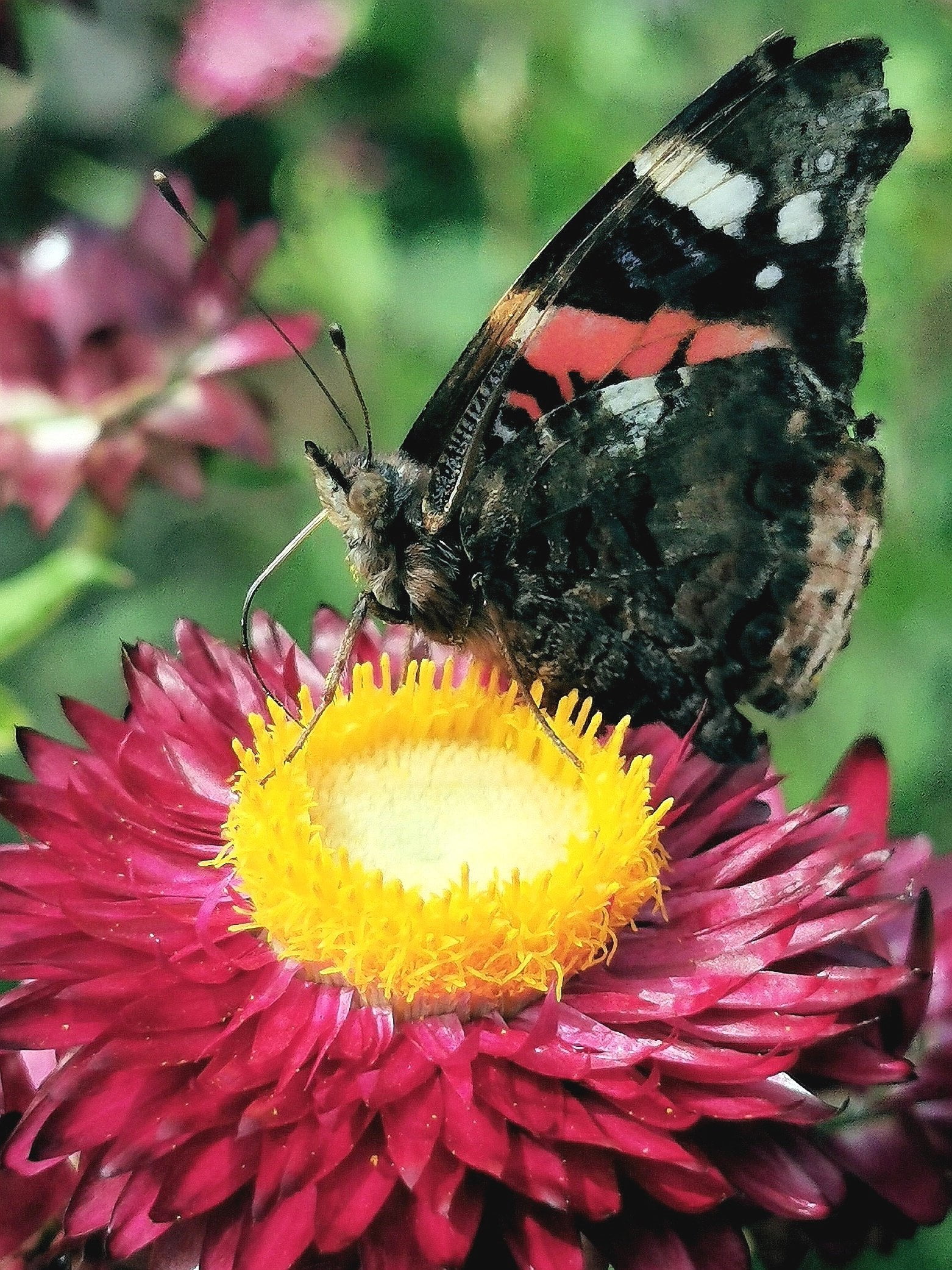 In onze tuin zien we verschillende soorten bijen, zweefvliegen en vlinders op de strobloemen. Het is fascinerend te zien hoe ze in het fluweelzachte hart een ronde dansje maken en zich tegoed doen aan deze bloem.