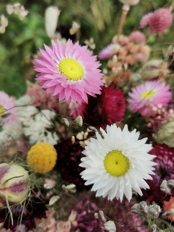 Deze eenjarige zonnetjes zijn zowel in de tuin als vers op de vaas ontzettend leuk. Ook zijn ze heel geschikt om te drogen en er droogbloemen creaties mee te maken. De bloemen zijn wit, licht roze of donkerroze. Het is een vrij lage soort, de hoogte is ongeveer 50 cm. Zaai of plant ze daarom vooraan in een plantbed of tuinborder. Ze kunnen ook goed in een pot gezaaid worden. Op de foto’s zie je de Zonnestrobloem in een droogbloemen boeket met onder andere Strobloemen, Juffertje in het groen, Groot trilgras en Bevertjes.